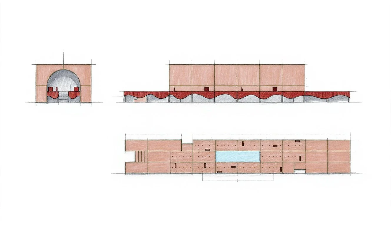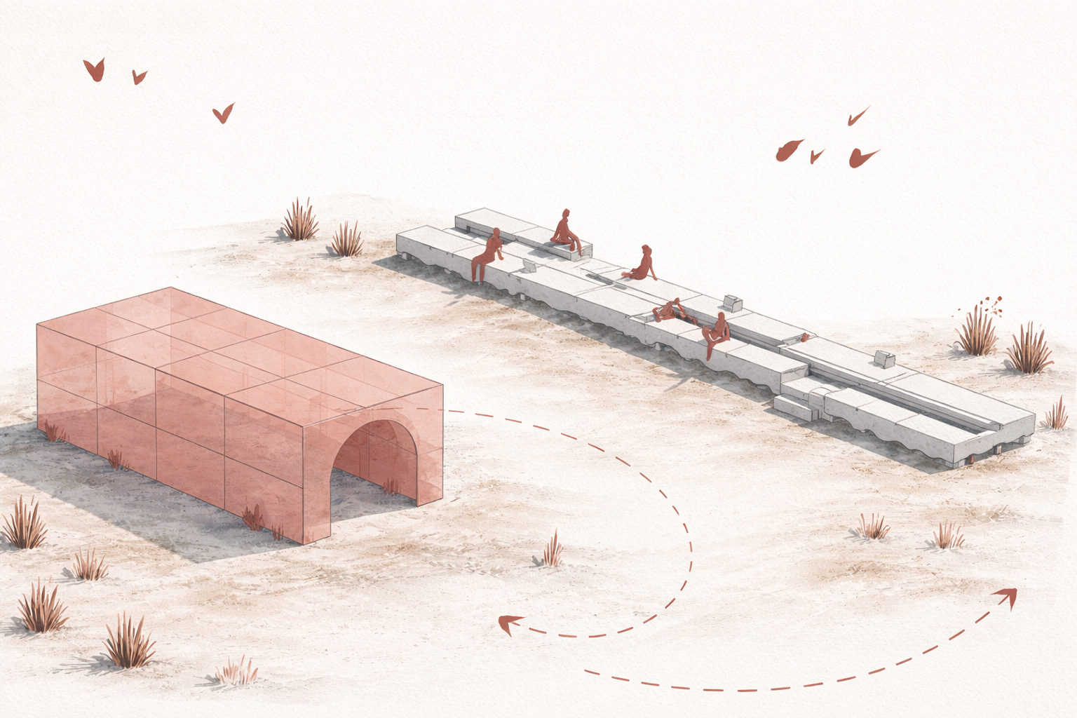 Nuestro objetivo es transformar una actividad cotidiana en una experiencia performativa, donde el paisaje se filtra a través de una capa onírica: una tela transparente de color rojo que proporciona sombra en un entorno soleado sin obstruir la vista.
